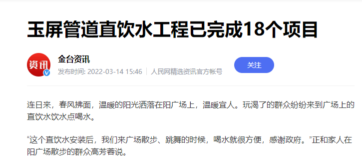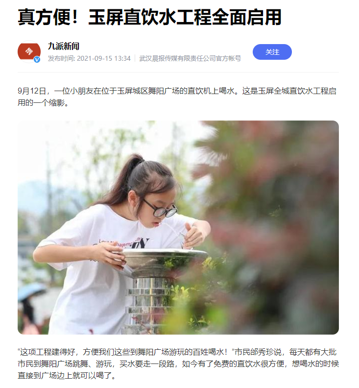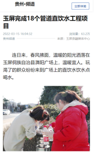 自玉屏縣(xiàn)全城直飲水工程啟動以來,玉屏縣的居民們已先後(hòu)喝上優質的管(guǎn)道直飲(yǐn)水(shuǐ),並得到當地居民(mín)們的一致稱讚與新聞媒體的(de)報道推廣;其所有直飲水項目運營商為貴州心泉管(guǎn)道直飲水有限公司(以下簡稱貴州心泉),截至(zhì)目前已通水的18個(gè)項目中有(yǒu)16個項目所使用的直飲水設備為我司(sī)提供,覆蓋範(fàn)圍有(yǒu)機關事業單位、中小學幼兒園(yuán)、醫療衛生係統、市民廣(guǎng)場及社區等。