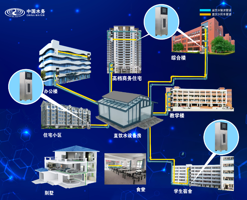 經不鏽鋼管道接至單元樓(lóu)下或樓層(céng)中的終端售水機。利用(yòng)大型集中式水處理設備,以自來水為(wéi)原水,通過現有的(de)先進水處理工藝,製(zhì)造出符(fú)合(hé)國(guó)家飲用(yòng)水標準的水,再通過管道將製好的水輸送到各個直飲水點。可24小時為居民提供新(xīn)鮮直(zhí)飲(yǐn)水。
