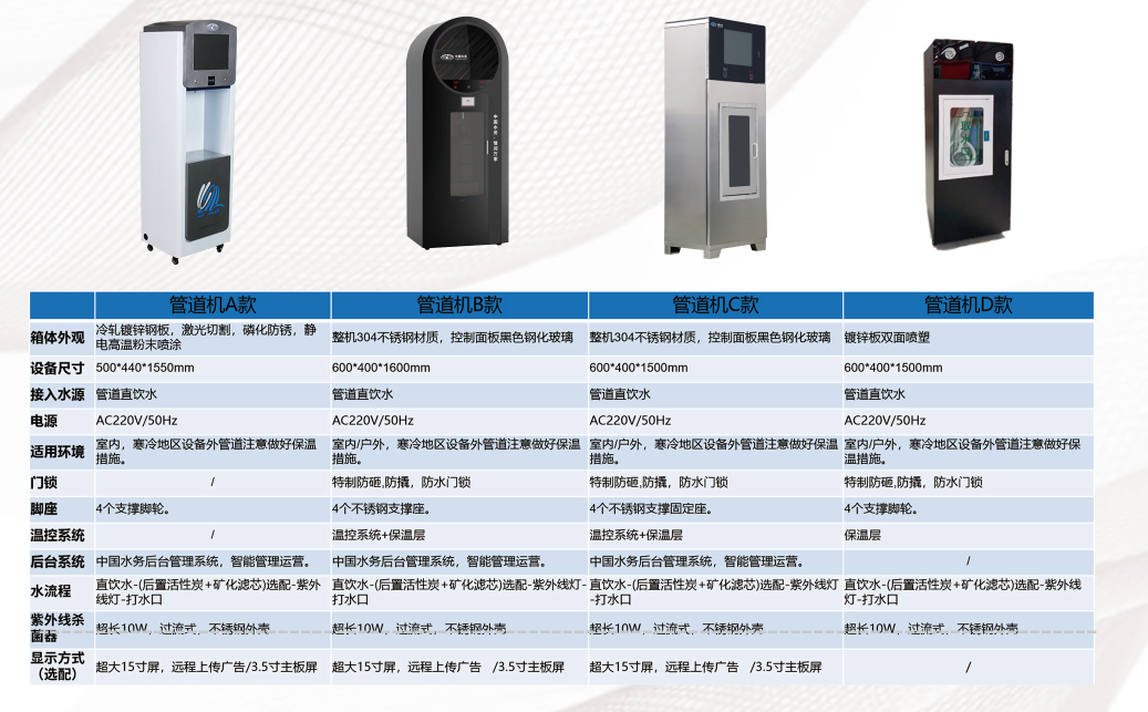 3.相對與售水機放置相(xiàng)對集(jí)中,數量較少(shǎo),居民取水需(xū)要走一定距離,管道機可放(fàng)置單元樓下或(huò)樓層中,將健康水送至家門口;