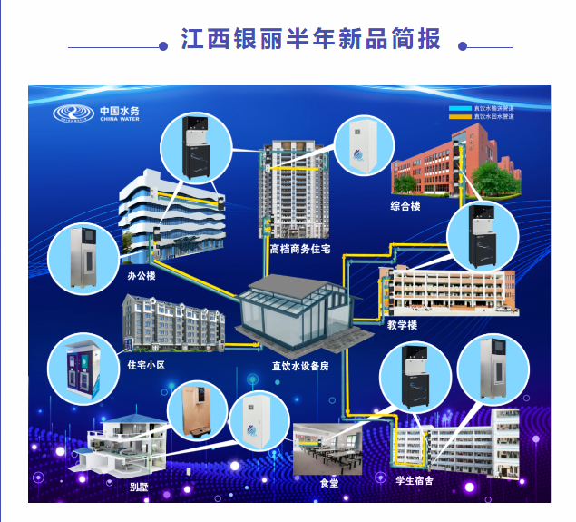 這半年來,在探索管道直飲水新模式同時,江西銀麗也根(gēn)據年初計劃陸續推出新產品,目前今年推出的新產品(pǐn)有單膜直(zhí)飲水設備、二代商務機3款、管道機4款、移動智能水屋2款與售水站2款。