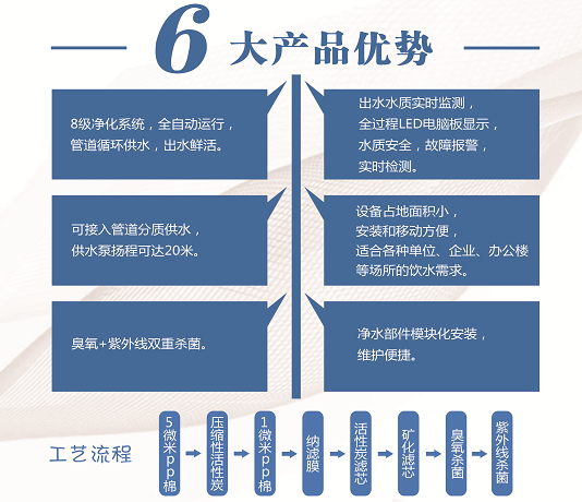 目前公(gōng)司設計並生產的商務直飲水機有三款(kuǎn),本次展覽為其中的兩款,皆采用8級過濾係統,其具有占地麵積小、全自動控製、雙重殺菌、模塊化安裝和實時監控等優勢特(tè)點。