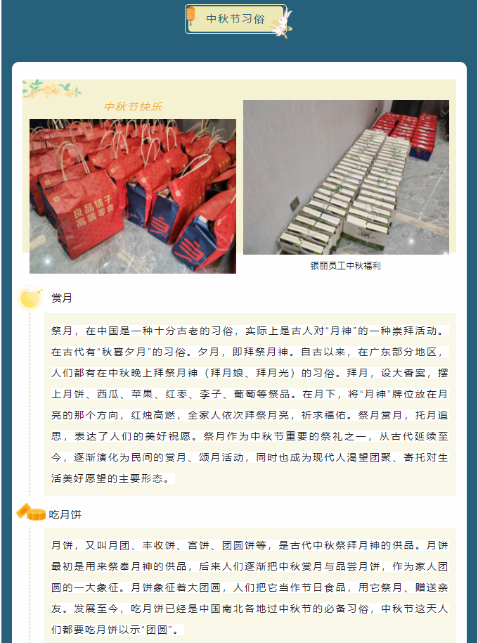 花好月圓夜,千(qiān)裏共嬋娟。為感謝全體員工(gōng)一直以來為公司發展付出的辛(xīn)勤努力,讓(ràng)每一位員工切實(shí)感受到江西銀麗大家庭的溫(wēn)暖。在9月9日上午(wǔ),公司為全體員工提前送上了中秋節禮品,一(yī)袋袋禮品代表著公司對每一(yī)位員工的深情關懷和真摯祝福!