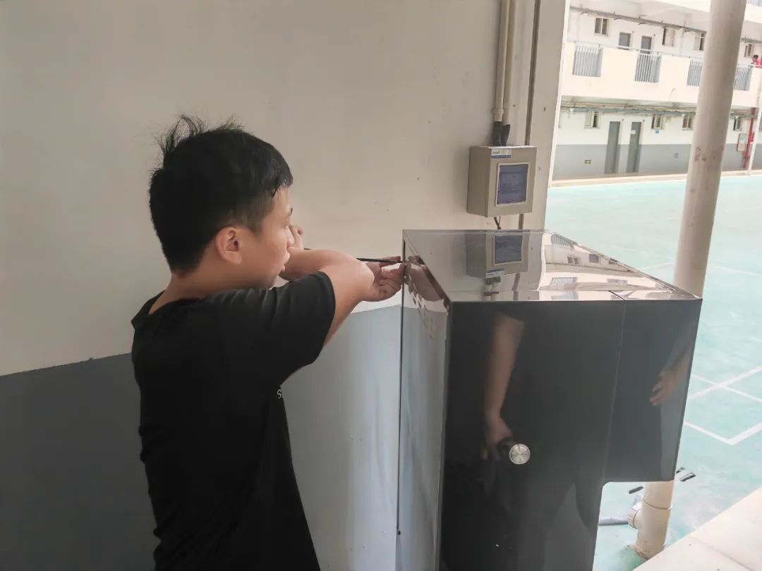 在(zài)新學生來到之前,公司業務(wù)部員工與維(wéi)護(hù)人員檢查飲水終端(飲水機)運(yùn)行情況,將一些非正常出水、水量出水小等問題及時處理,並將一(yī)些線路線頭裸露等安全隱患。直飲水機房中淨水(shuǐ)設備因有公司獨(dú)立自主開(kāi)發的後台監控平台,24小時全天候(hòu)監控(kòng)維護中。