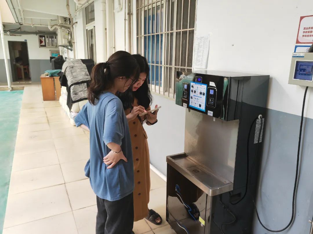 在新同學(xué)到校(xiào)之際,“銀麗人”緊守飲(yǐn)水(shuǐ)機旁,幫助新同學掃碼取“鮮活水”。