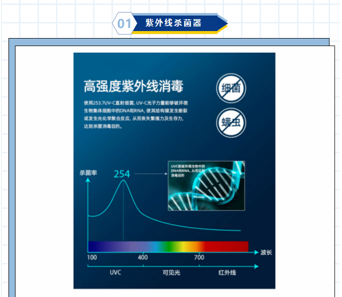 紫外線消毒技術是基於現代防疫學、 光學、生物學和(hé)物理化學的基礎(chǔ)上,利用特(tè)殊設計的高(gāo)效率(lǜ)、高強度和長壽命的 C 波段紫外光發生(shēng)裝置;