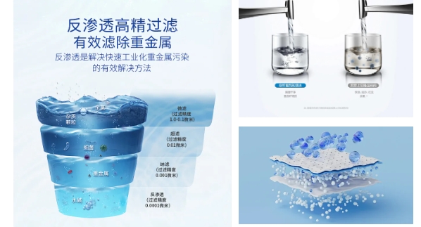 反滲透“簡稱RO”,其原理是原水在高壓力的作用下通(tōng)過反滲(shèn)透膜,水中的溶劑由高濃度向(xiàng)低(dī)濃度擴散從(cóng)而達到分離、提純、濃縮的目的,由於它同自然界的滲透方向相反。