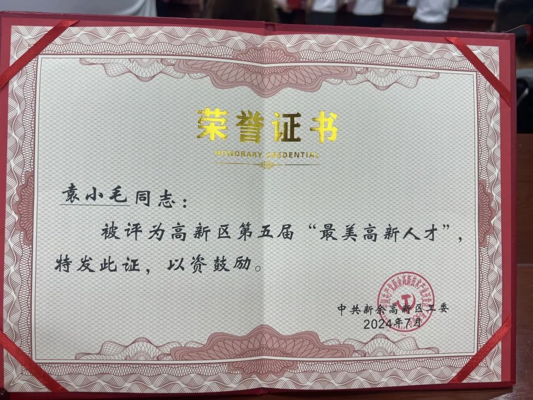 為深(shēn)入貫徹落實習近平(píng)總書記關於做好新時代人才工作的重要思想和考察江西重要(yào)講話精神,落實省委、市委關於(yú)人才工作(zuò)的部署(shǔ)要求,根據相關文(wén)件精神,2024年(nián)7月31日下午新餘市(shì)高新技術開發區(qū)工委隆重舉行第五屆“最美高(gāo)新人才”表彰大會,江西銀麗(lì)袁小毛先生榮獲本屆“最美高新人才”稱號。