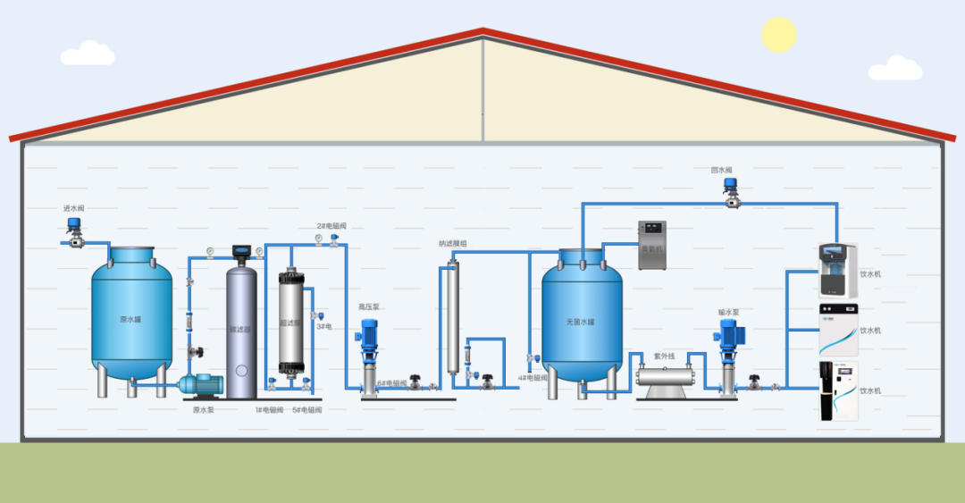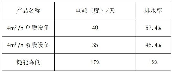 以某項目地豪華雙膜款(kuǎn) Q=4 m³/h 設備為例:日原水總(zǒng)量:7.33m³ 日排水總量:3.33 m³(含預處(chù)理(lǐ)反洗和再生水、 膜衝洗水等),產水率:54.6%,係統廢水比:理論值 1.2:1(產水:排水)特此說明,廢水比不(bú)是越高越好,也不是越低(dī)越好。廢水比會受到水源、水質、溫度、壓力等的影響(xiǎng),該廢水比僅(jǐn)為理(lǐ)論計算, 僅供參考。