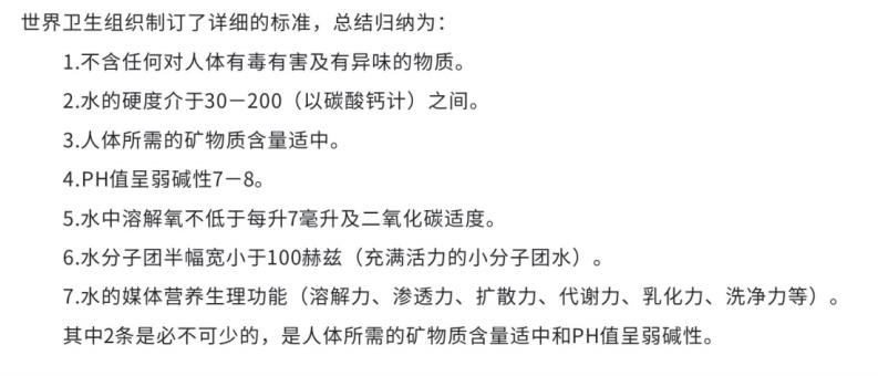 簡單地說健康(kāng)水就是有益於人體健康的飲用水,世界衛生組織(zhī)製定了詳細的(de)標準,總(zǒng)結歸納為: