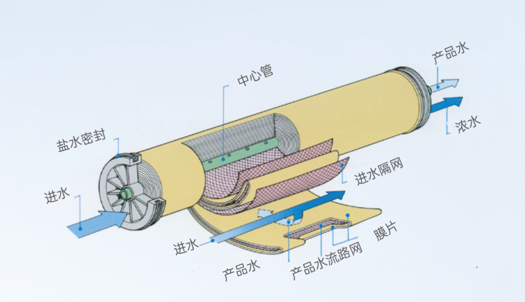 反滲透膜是最精細的一種膜分離產品,其能有效截留所(suǒ)有溶解鹽分及分子量大(dà)於100的(de)有機物,同時允許(xǔ)水分子通過。反滲透膜的運行壓(yā)力一般介於苦鹹水的12bar 到海水的70bar。