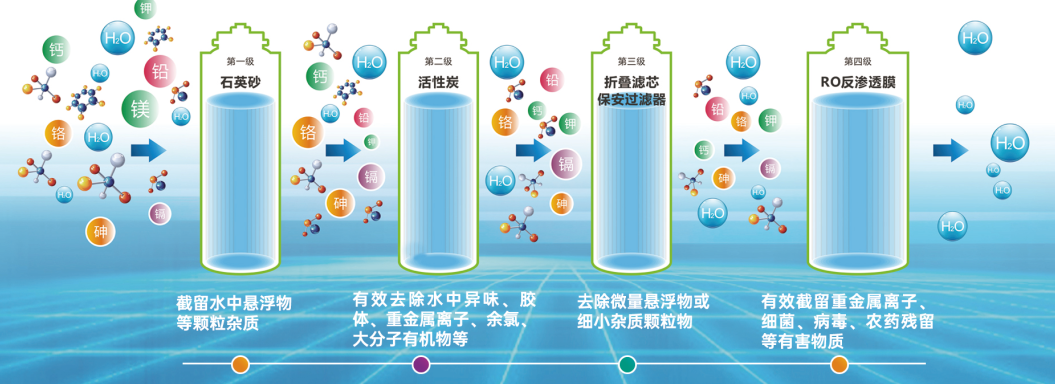關於飲水的淨化過濾,所使用的材料並不複雜(zá),主要有不鏽鋼濾網、PP棉(mián)、活性(xìng)炭和各種過濾膜(mó),前麵(miàn)三種材(cái)料由(yóu)於孔徑較大,隻去除部分細菌、病毒、水溶性鹽和重金屬離子,所以淨水工藝的主(zhǔ)角是最後的過濾膜。